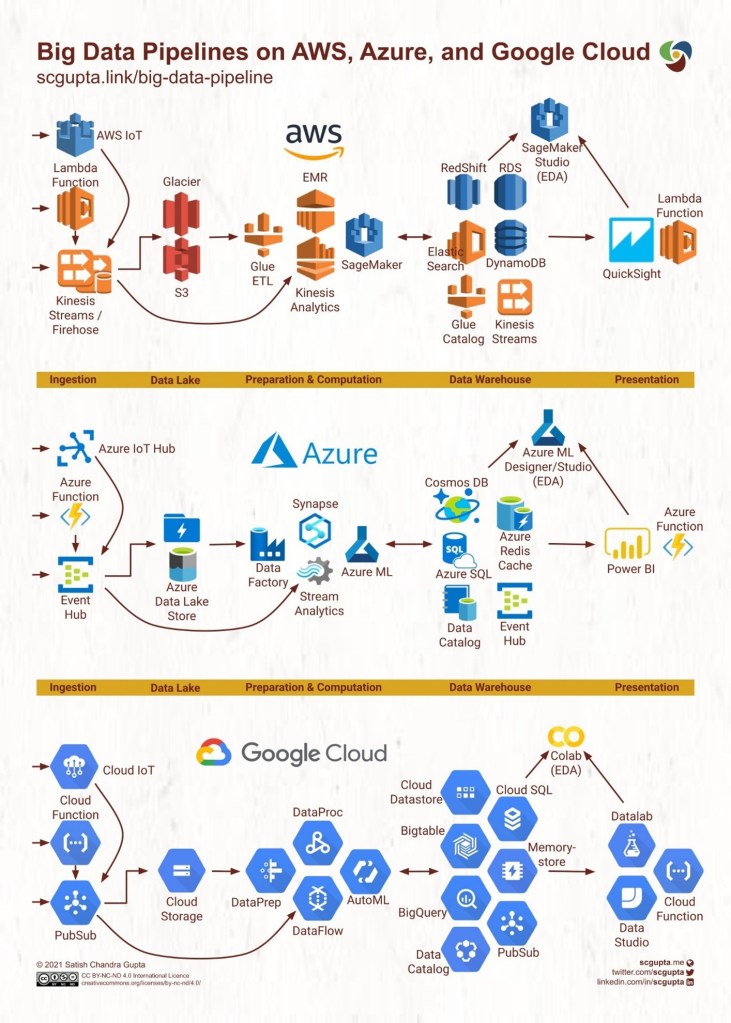 One refreshingly cogent diagram in this article, shown below, shows a comparison of cloud services used in an end-to-end data pipeline. From data acquisition and ingestion to data storage and processing and finally to EDA (exploratory data analysis) and visualization. Not only does this diagram illuminate some of the meaning behind the inscrutable names of cloud services by showing them in their relative position in a data pipeline, but it also illustrates a uniformity between the offerings of the various cloud service providers.