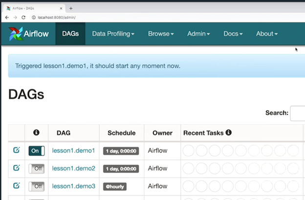 As I mentioned before, the Airflow GUI can be used to monitor the DAGs in the pipeline. The GUI will show active DAGs, the current task, the last time the DAG was executed, and the current state of the task (whether it has failed, how many times it’s failed, whether it’s currently retrying a failed DAG, etc.). DAGs can be trigger manually from the GUI as well as canceled. DAGs can also be “turned off” and removed from the schedule.