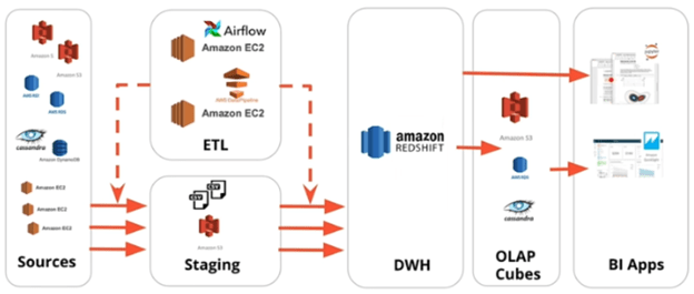 As a final review, I’ve included a diagram below from the course that I’ve shared before that shows the AWS services in their relative positions in a sample ETL pipeline. The only service missing from this diagram is the Data Lake which would consist of an EMR cluster running Spark (and potentially HDFS) and would be a middle-man between the EC2 instance running Airflow and the dotted lines pushing data from Source to Staging to DWH.