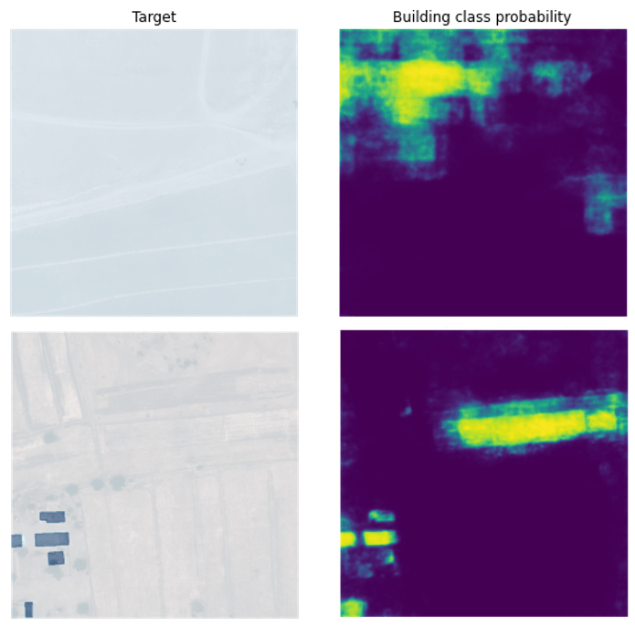 While the F1-score for segmentation was reasonably high, the model’s performance measured by Intersection over Union for segmentation was slightly lower: 0.64, which suggests that the model suffered from false positives more than false negatives. By visualizing some of the prediction maps from this model, we can see that this model tends to hallucinate buildings around farmland and highways, as shown in the image below. This is understandable considering that the hard edges of roads and farmland have the distinct signature of being man-made while also having a similar color to many of the concrete and brick buildings made from local dirt and clay. I believe this problem can be solved by creating distance maps as segmentation targets, which will be described in more detail later in this article.