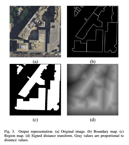 The second technique that I’ve identified for improving the U-net’s building detection accuracy is also a pre-processing method for the training data using distance maps. Yuan (2016) created the distance maps shown below by setting the pixel value in the target map equivalent to the pixel distance to the nearest border, with pixels on the interior of buildings having positive values and exterior pixels having negative values. This puts a higher penalty on false positives (addressing the hallucinating-buildings problem that I mentioned before) while also giving buildings some spatial structure for the model to learn.